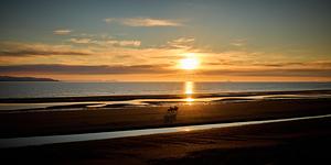 Sunset over the North Pacific, from the Homer Spit. Active volcanoes, Mt. Douglas and Mt. Augustine can be seen on the horizon. Horse and rider included.